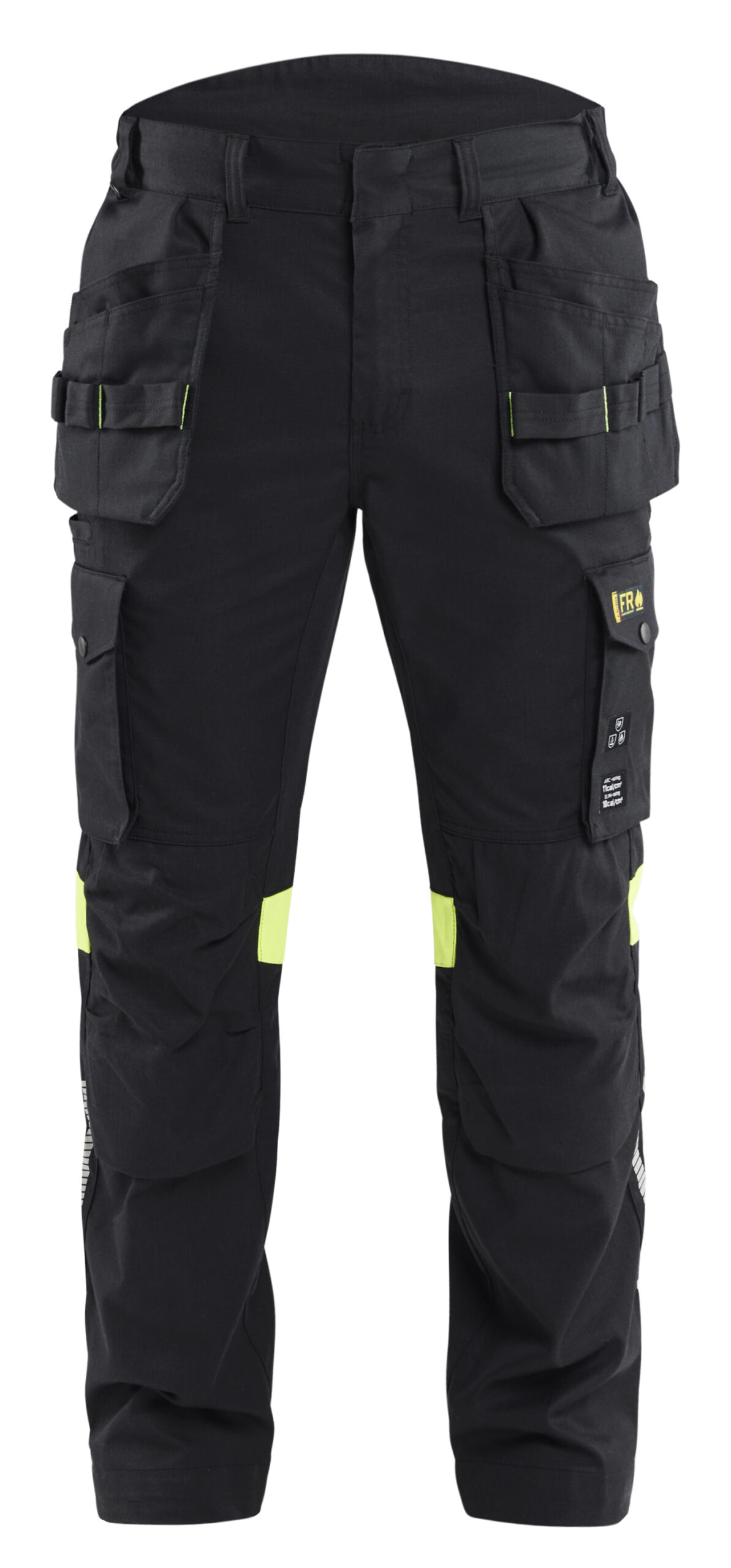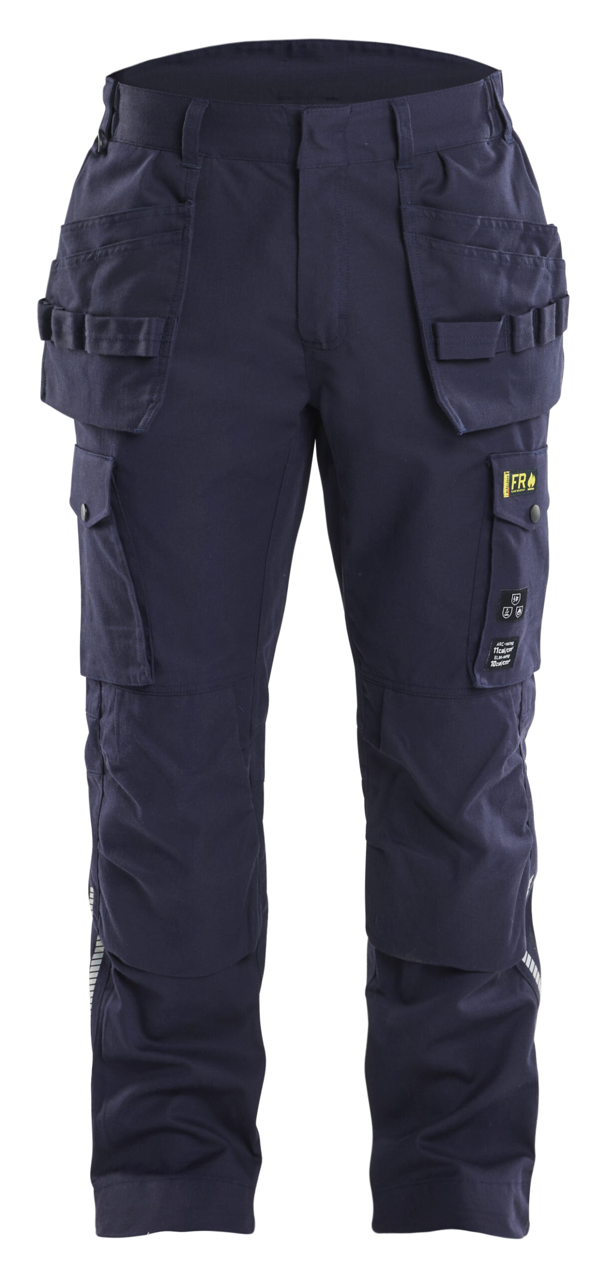 Metalfri håndværkerbuks til brug på områder, der kræver fleksibilitet og god beskyttelse. Bukserne byder på høj komfort og påsyede værktøjslommer. Forhøjet talje bagpå med elastik i siderne for øget komfort. Benlommer med læg, den venstre med ID-kortholder og to baglommer med trykknapper. Forbøjede knæ med udvendige knælommer, der åbnes nedefra. Ankelbredden justeres med trykknapper. Refleksdetaljer på bagsiden af ??benene og på benlommer. Testet og godkendt til industrivask – EN 15797, max. 50 vaskecyklusser. Certificeret iht. EN 1149-5, EN ISO 11612, EN 61482-2.