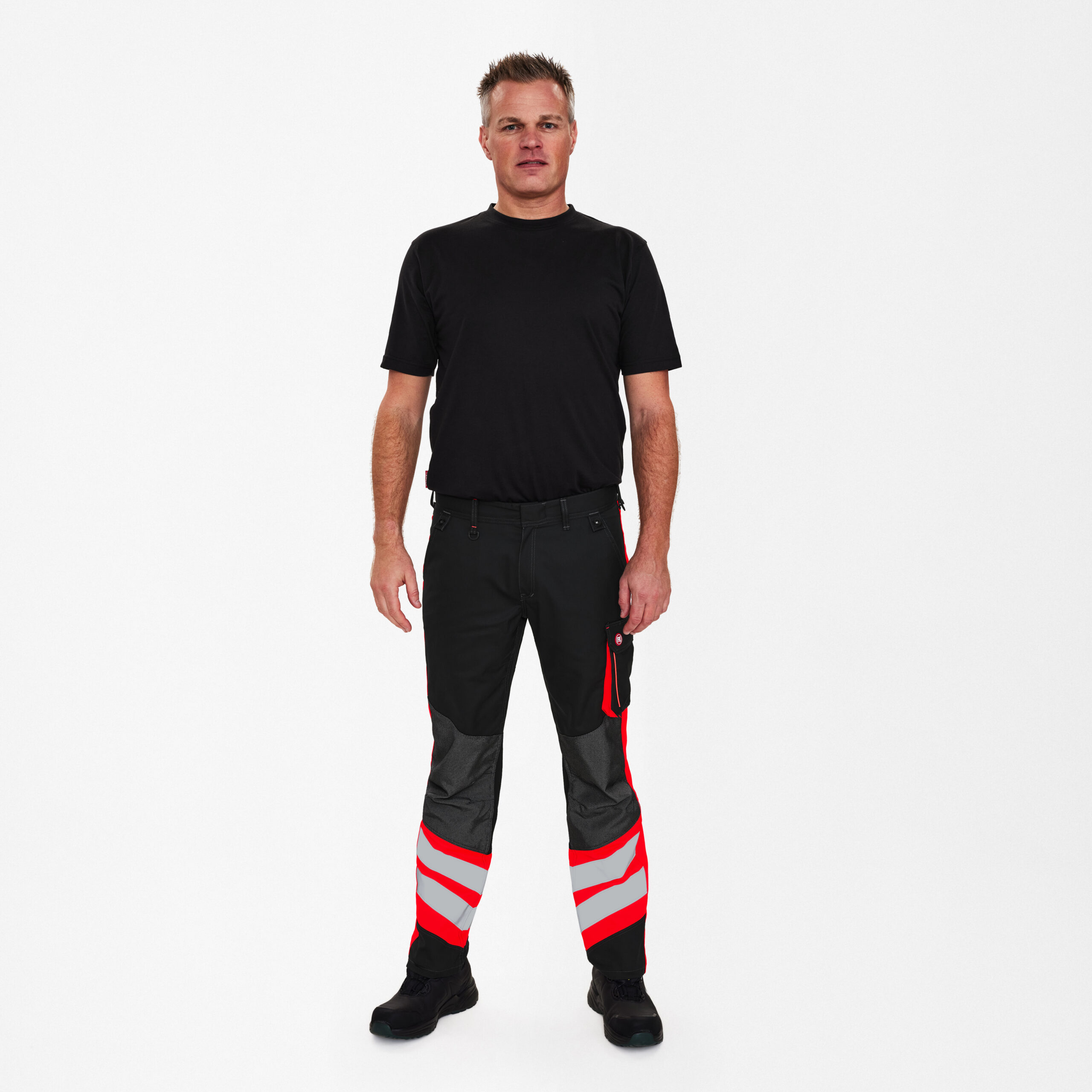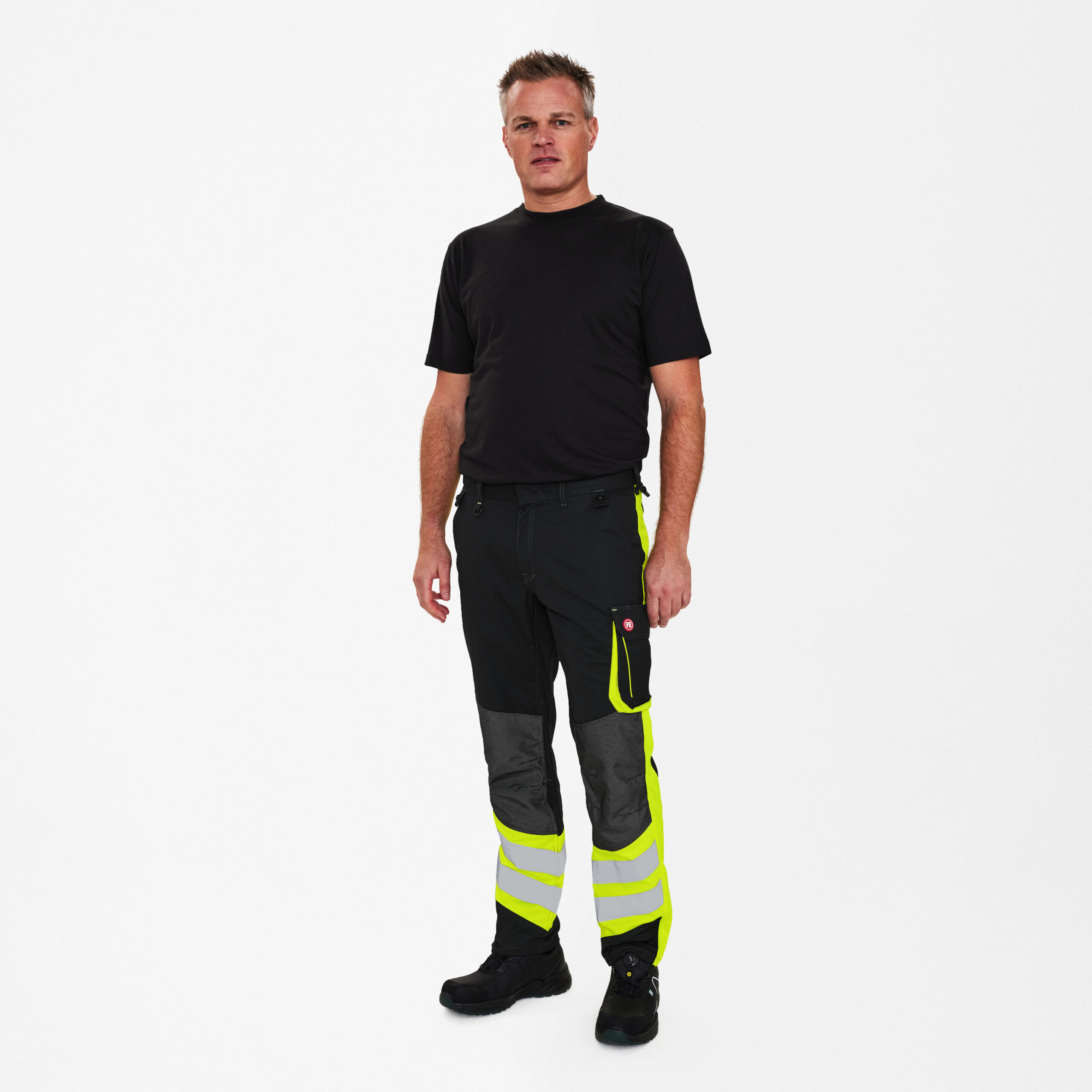 Funktionelle bukser med mange praktiske detaljer. Optimal pasform med bl.a. ergonomisk formet knæparti og panel i indersøm, der giver en behagelig skridtsøm. Panelet i indersømmen er i et ekstra strækbart og ventilerende materiale, hvilket gør komforten ekstra høj. Elastik i taljen bagpå sikrer god pasform og gør, at buksen bliver hvor den skal f.eks. under ind- og udstigning af bilen. D-ring foran til påsætning af f.eks. ID-kort. To rummelige skrålommer foran. To baglommer. I venstre side er der en lårlomme med klap samt en seperat telefonlomme. I højre side er der en indvendig lomme til opbevaring af f.eks. tommestok. Forstærket knæparti. Buksen er ikke certificeret i henhold til EN ISO 20471, men har reflekser omkring benene forneden og detaljer af flourescerende materiale for øget synlighed.