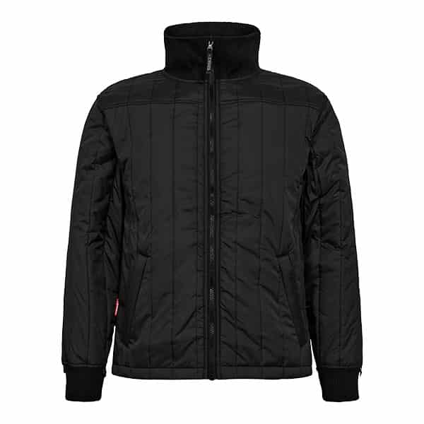 Lynlås i front. To udvendige lynlåslommer. To åbne inderlommer, den ene med blyantlomme. Rib i hals og ærmer samt forneden på ryg.