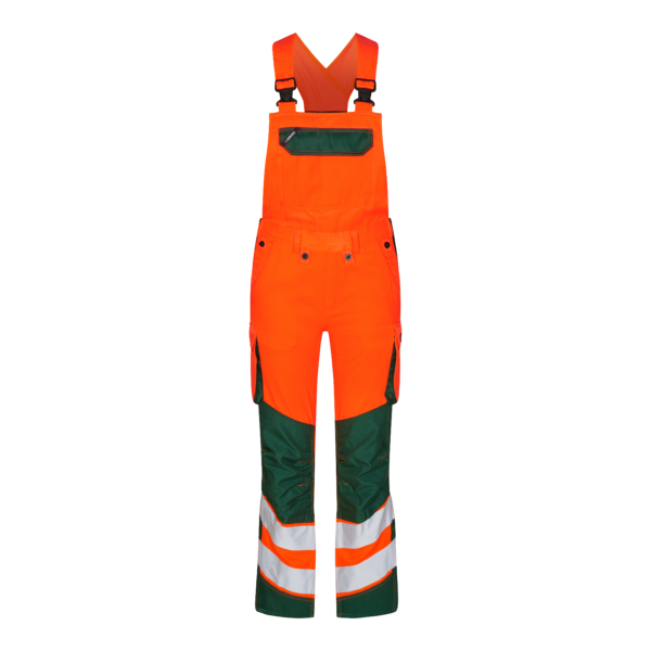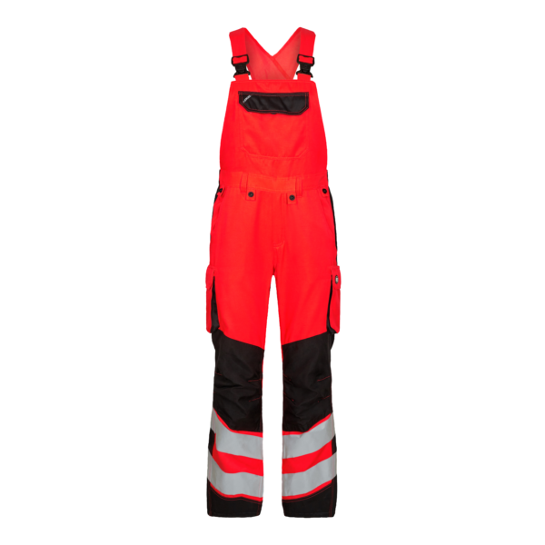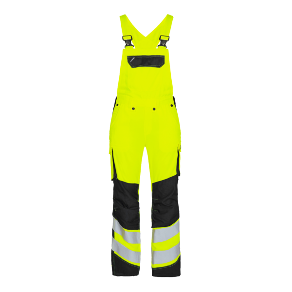 Funktionel fluorescerende overall specialdesignet til kvinder. Optimal pasform med bl.a. ergonomisk formet knæparti. Metervaren er slidstærk og åndbar og lavet af 50% re-genereret polyester. Elastik i taljen bagpå sikrer god pasform og gør, at overallen bliver hvor den skal ved bevægelse. D-ring ved smæk til påsætning af f.eks. ID-kort. Høj ryg og ribpaneler i siderne for optimal pasform og øget komfort. Regulerbare seler. Smæklomme med klap og velcro. Indvendig på smæk er der en lynlåslomme. To lårlommer som lukkes med velcro. I venstre side har lårlommen en ekstra telefonlomme samt indvendig lomme til bl.a. walkie talkie. I højre side er der en indvendig lomme til opbevaring af f.eks. tommestok. Knæforstærkning/Knælomme i CORDURA® materiale med velcrolukning forneden. Reflekser om underbenet. Beklædningsklasse 2. Testet efter 50 vaske.