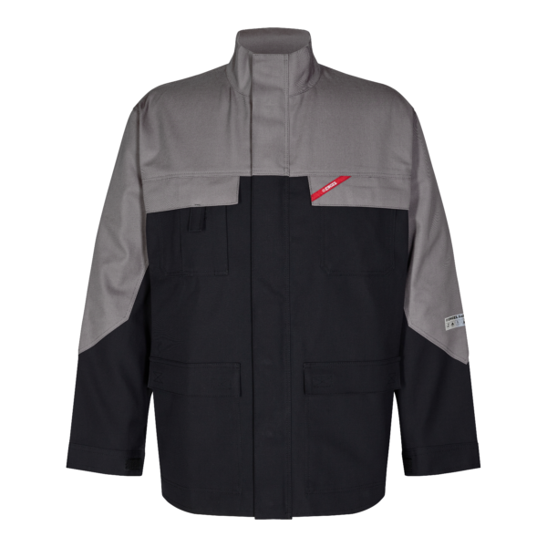 Jakke med dobbelt stolpelukning og skjulte trykknapper i front. Brystlommer med klapper og velcro, den højre med mobiltelefonlomme. To indvendige lommer med lynlås. To forlommer med klapper og velcro. Manchetter med velcro. Viddelæg i ryg for bedre komfort. Gennemtænkte detaljer ved lommer og læg, der forhindrer gløder i at sætte sig fast. Antistatisk, flammehæmmende og beskytter mod væskeformige aerosoler, spray og lette stænk fra kemikalier.