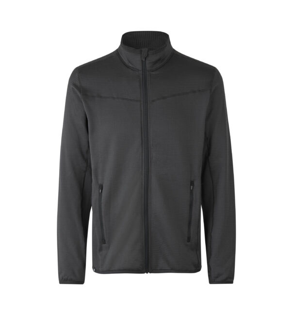 Sporty, fleece cardigan i behagelig stretch materiale. Blød indvendig vaffel fleece struktur og YKK lynlåse i front og sidelommer, samt hul til tommelfinger i ærmerne. Cardiganen kan også bruges som et isolerende lag under jakken. Tætsiddende pasform.