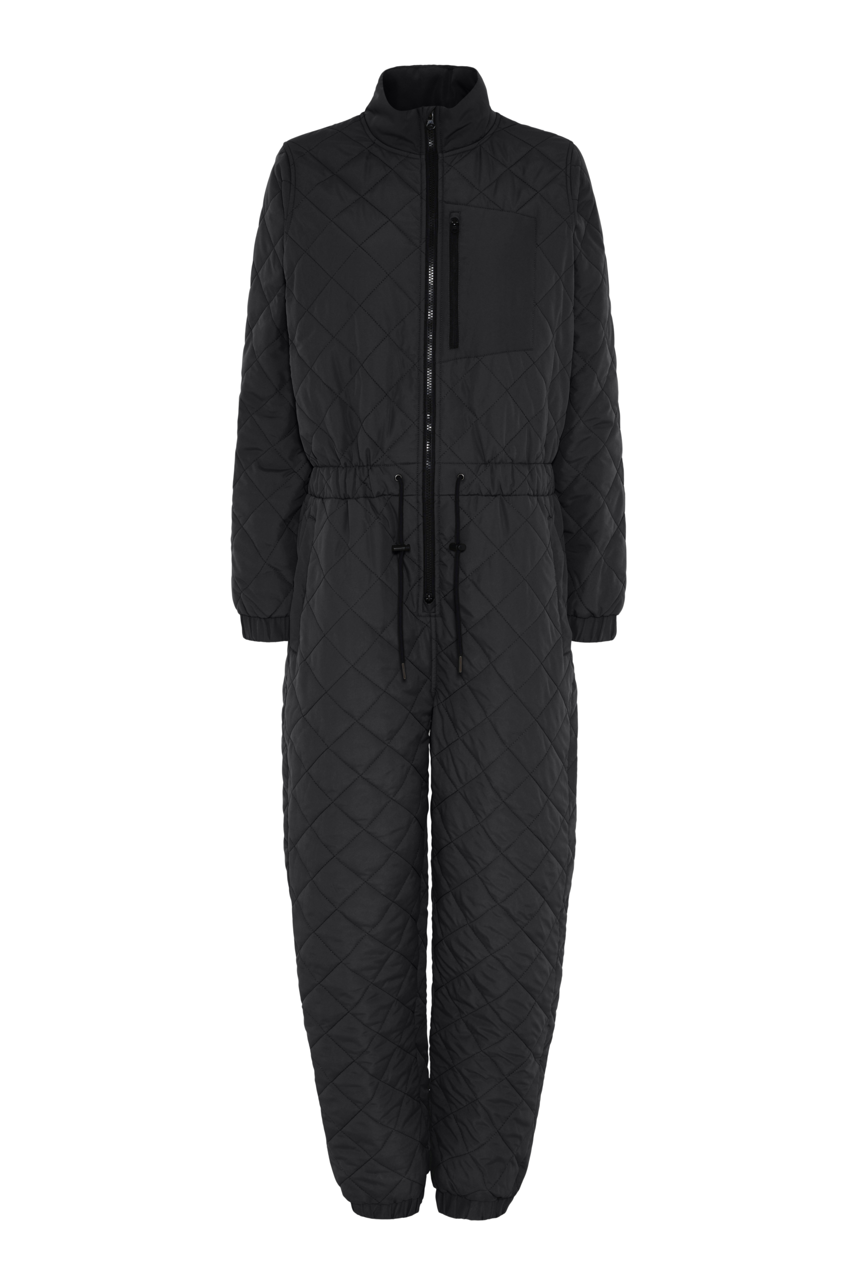 Elastik ved ankler|Elastik ved ærmer|Justering i taljen|En brystlomme med lynlås|Lynlås-cover ved halsen|Quiltet termodragt i damefacon|Synlig frontlynlås|To sidelommer med trykknapper