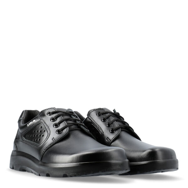 Let, komfortabel og skridhæmmende snøresko af åndbart og slidstærkt Permair® læder. Stødabsorberende og åndbar indlægssål af let og antibakterielt materiale. Fås i sort og hvid. Str. 35-50. O1 FO SR.