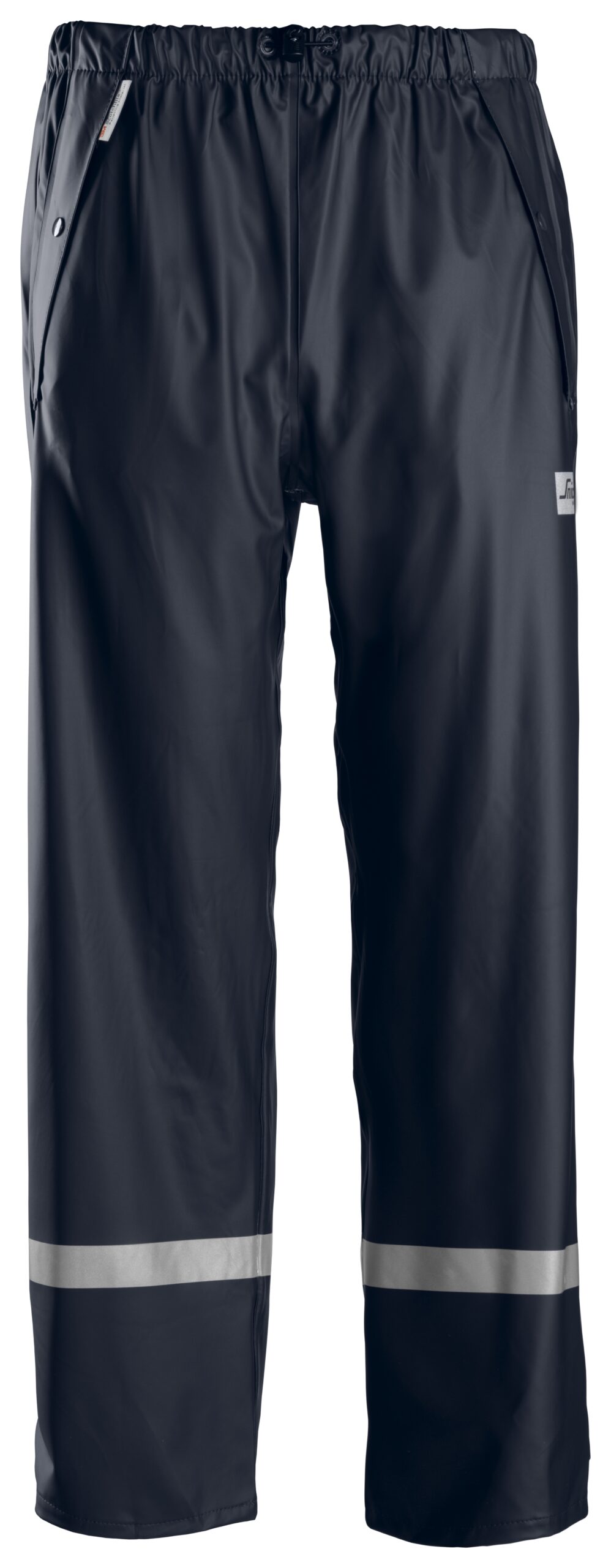 Hold regnen ude. Med disse PU-belagte regnbukser med svejsede sømme får du en 100% tør arbejdsdag. Fremstillet i blødt, elastisk materiale for overlegen komfort. Overholder EN 343.. To store forlommer. Justering med burrelukning ved anklerne. Praktisk design – lette at trække på